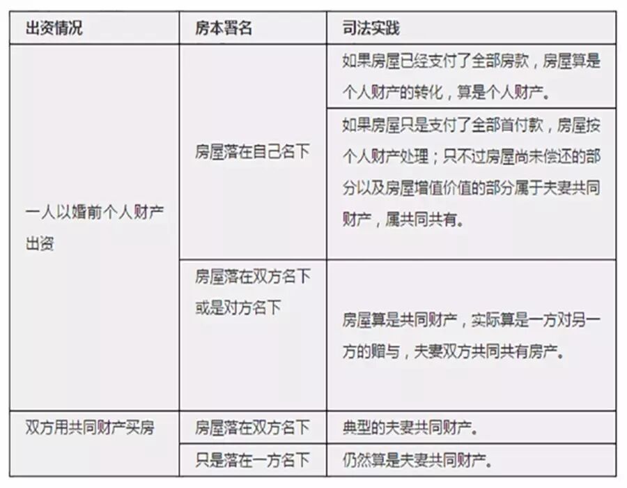 | 出资情况 | 房本署名 | 司法实践处理 |